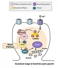 One of the major Rho GTPases involved in spine morphogenesis is RhoA, a protein that also modulates the regulation and timing of cell division. In the context of activity in neurons, RhoA is activated in the following manner: once calcium has entered a cell through NMDA receptors, it binds to calmodulin and activates CaMKII, which leads to the activation of RhoA.[10] The activation of the RhoA protein will activate ROCK, a RhoA kinase, which leads to the stimulation of LIM kinase, which in turn inhibits the protein cofilin. Cofilin's function is to reorganize the actin cytoskeleton of a cell; namely, it depolymerizes actin segments and thus inhibits the growth of growth cones and the repair of axons.[13]