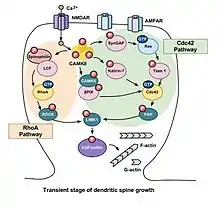 The morphogenesis of dendritic spines is critical to the induction of long-term potentiation (LTP).[7][8] The morphology of the spine depends on the states of actin, either in globular (G-actin) or filamentous (F-actin) forms. The role of Rho family of GTPases and its effects in the stability of actin and spine motility[9] has important implications for memory. If the dendritic spine is the basic unit of information storage, then the spine's ability to extend and retract spontaneously must be constrained. If not, information may be lost. Rho family of GTPases makes significant contributions to the process that stimulates actin polymerization, which in turn increases the size and shape of the spine.[10] Large spines are more stable than smaller ones and may be resistant to modification by additional synaptic activity.[11] Because changes in the shape and size of dendritic spines are correlated with the strength of excitatory synaptic connections and heavily depend on remodeling of its underlying actin cytoskeleton,[12] the specific mechanisms of actin regulation, and therefore the Rho family of GTPases, are integral to the formation, maturation, and plasticity of dendritic spines and to learning and memory.