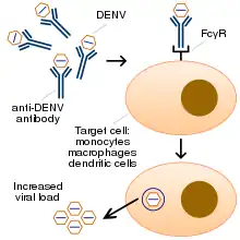 It is not entirely clear why secondary infection with a different strain of dengue virus places people at risk of dengue hemorrhagic fever and dengue shock syndrome. The most widely accepted hypothesis is that of antibody-dependent enhancement (ADE). The exact mechanism behind ADE is unclear. It may be caused by poor binding of non-neutralizing antibodies and delivery into the wrong compartment of white blood cells that have ingested the virus for destruction.[32][35] There is a suspicion that ADE is not the only mechanism underlying severe dengue-related complications,[22][33] and various lines of research have implied a role for T cells and soluble factors such as cytokines and the complement system.[48]