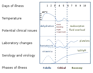 In some people, the disease proceeds to a critical phase as fever resolves.[27] During this period, there is leakage of plasma from the blood vessels, typically lasting one to two days.[21] This may result in fluid accumulation in the chest and abdominal cavity as well as depletion of fluid from the circulation and decreased blood supply to vital organs.[21] There may also be organ dysfunction and severe bleeding, typically from the gastrointestinal tract.[17][21] Shock (dengue shock syndrome) and hemorrhage (dengue hemorrhagic fever) occur in less than 5% of all cases of dengue;[17] however, those who have previously been infected with other serotypes of dengue virus ("secondary infection") are at an increased risk.[17][32] This critical phase, while rare, occurs relatively more commonly in children and young adults.[27]