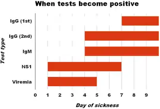 These laboratory tests are only of diagnostic value during the acute phase of the illness with the exception of serology. Tests for dengue virus-specific antibodies, types IgG and IgM, can be useful in confirming a diagnosis in the later stages of the infection. Both IgG and IgM are produced after 5–7 days. The highest levels (titres) of IgM are detected following a primary infection, but IgM is also produced in reinfection. IgM becomes undetectable 30–90 days after a primary infection, but earlier following re-infections. IgG, by contrast, remains detectable for over 60 years and, in the absence of symptoms, is a useful indicator of past infection. After a primary infection, IgG reaches peak levels in the blood after 14–21 days. In subsequent re-infections, levels peak earlier and the titres are usually higher. Both IgG and IgM provide protective immunity to the infecting serotype of the virus.[25][28][35] In testing for IgG and IgM antibodies there may be cross-reactivity with other flaviviruses which may result in a false positive after recent infections or vaccinations with yellow fever virus or Japanese encephalitis.[27] The detection of IgG alone is not considered diagnostic unless blood samples are collected 14 days apart and a greater than fourfold increase in levels of specific IgG is detected. In a person with symptoms, the detection of IgM is considered diagnostic.[25]