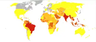 The earliest descriptions of an outbreak date from 1779.[15] Its viral cause and spread were understood by the early 20th century.[16] Dengue has become a global problem since the Second World War and is common in more than 120 countries, mainly in Southeast Asia, South Asia and South America.[7][17][15] About 390 million people are infected per year, about half a million require hospital admission,[1] and approximately 40,000 die.[7][8] In 2019, a significant increase in the number of cases was seen.[18] Apart from eliminating the mosquitos, work is ongoing for medication targeted directly at the virus.[19] It is classified as a neglected tropical disease.[20]