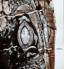 Thin sections are prepared by first embedding a suitable specimen in epoxy resin. The embedded specimen can then be mounted and cut with a precision saw.[6] The resulting slice is attached to a slide and ground down, then polished, until it is thin enough, with a suitable surface to be examined with a microscope.[6]