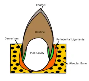 - Cementum - This tissue covers the root of a tooth and is an attachment tissue that forms part of the periodontium. It is typically infilled with Sharpey's fibers that help anchor the tooth in place in the socket.[6]