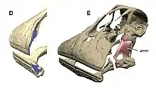 These batteries were formed from hundreds of teeth which were stacked in rows upon rows and formed a grinding surface to process plant foods.[24] Histological study of these batteries found that they were not cemented together as previously thought, but that each tooth in the battery was separately moving and supported by ligamenture such that the whole structure was flexible.[9][24] Comparable to shark teeth, dental batteries exhibited polyphyodonty, growing new teeth on the inside which migrated over time to replace the outer teeth. Unlike sharks however, who lose all of their old teeth, teeth in the rapidly growing dental battery would wear completely down and be reabsorbed by the renewing structure around it.[25]
