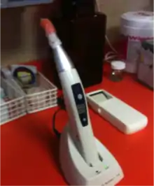 A dental curing light is a piece of dental equipment that is used for polymerization of light-cure resin-based composites.[1] It can be used on several different dental materials that are curable by light. The light used falls under the visible blue light spectrum. This light is delivered over a range of wavelengths and varies for each type of device. There are four basic types of dental curing light sources: tungsten halogen, light-emitting diodes (LED), plasma arcs, and lasers. The two most common are halogen and LEDs.