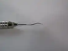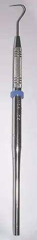 An 11/12 type explorer is a double-ended dental assessment instrument with mirror image working-ends.[4] The 11/12 dental explorer should be considered a dental hygienists most important instrument for the detection of subgingival and supragingival calculus. This instrument is used with the modified pen grasp and a feather light grip allowing for detection of both grainy and bindable deposits. Learning its adaptability is critical for the successful tactile sensations needed for the confirmation of calculus removal.