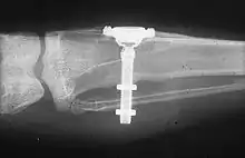 The early part of the 20th century saw a number of implants made of a variety of materials. One of the earliest successful implants was the Greenfield implant system of 1913 (also known as the Greenfield crib or basket).[73] Greenfield's implant, an iridioplatinum implant attached to a gold crown, showed evidence of osseointegration and lasted for a number of years.[73] The first use of titanium as an implantable material was by Bothe, Beaton and Davenport in 1940, who observed how close the bone grew to titanium screws, and the difficulty they had in extracting them.[74] Bothe et al. were the first researchers to describe what would later be called osseointegration (a name that would be marketed later on by Per-Ingvar Brånemark). In 1951, Gottlieb Leventhal implanted titanium rods in rabbits.[75] Leventhal's positive results led him to believe that titanium represented the ideal metal for surgery.[75]