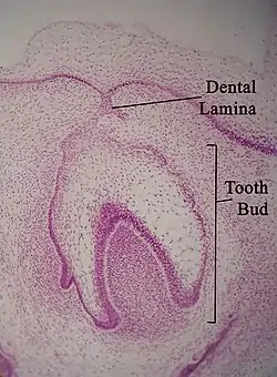 The dental lamina is a band of epithelial tissue seen in histologic sections of a developing tooth.[1][2] The dental lamina is first evidence of tooth development and begins (in humans) at the sixth week in utero or three weeks after the rupture of the buccopharyngeal membrane. It is formed when cells of the oral ectoderm proliferate faster than cells of other areas. Best described as an in-growth of oral ectoderm, the dental lamina is frequently distinguished from the vestibular lamina, which develops concurrently. This dividing tissue is surrounded by and, some would argue, stimulated by ectomesenchymal growth. When it is present, the dental lamina connects the developing tooth bud to the epithelium of the oral cavity. Eventually, the dental lamina disintegrates into small clusters of epithelium and is resorbed. In situations when the clusters are not resorbed, (this remnant of the dental lamina is sometimes known as the glands of Serres) eruption cysts are formed over the developing tooth and delay its eruption into the oral cavity. This invagination of ectodermal tissues is the progenitor to the later ameloblasts and enamel while the ectomesenchyme[3] is responsible for the dental papilla and later odontoblasts.