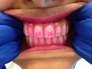 Gingivitis is an inflammatory lesion, mediated by host-parasite interactions that remains localised to the gingival tissue, it is a common result of plaque build-up around the gingival tissues. The bacteria found in the biofilm elicit a host response resulting in localized inflammation of the tissue.[21] This is characterized by the cardinal signs of inflammation including a red, puffy appearance of the gums and bleeding due to brushing or flossing.[22] Gingivitis due to plaque can be reversible by removal of the plaque. However, if left for an extended period of time, the inflammation may begin to affect the supporting tissues, in a progression referred to as periodontitis.[23]: 96–97 The gingivitis response is a protective mechanism, averting periodontitis in many cases.
