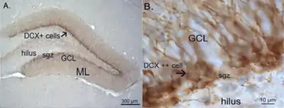 Between the hilus and the granule cell layer is a region called the subgranular zone which is a site of adult neurogenesis.[10]
