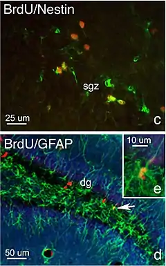 - Cameron HA, McKay RD (July 2001). "Adult neurogenesis produces a large pool of new granule cells in the dentate gyrus". J. Comp. Neurol. 435 (4): 406–17. doi:10.1002/cne.1040. PMID 11406822. S2CID 15254735.