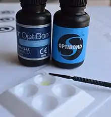 Dentin bonding refers to process of bonding a resin to conditioned dentin,[1] where mineral component is replaced with resin monomers to form a biocomposite comprising dentin collagen and cured resin. The adhesive-dentin interface forms a tight and permanent bond between dentin and composite resins.[2]