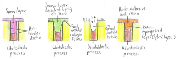 It can be accomplished by either etch-and-rinse (total etch) or self-etch adhesives. In etch-and rinse, acid will dissolve the minerals to a certain depth and leaves the highly porous dentinal collagen network suspended in water. Then, the collagen network is infiltrated with resin monomers. After chemical polymerization of these monomers happen, activated by light cure, it will result in a polymer-collagen biocomposite, commonly known as the hybrid layer:[2]