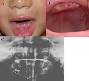 Similar clinical and radiographic features to that of type I and II are apparent for the adult (permanent) teeth. The main distinguishing feature is "shell teeth", a term used to describe the unique appearance of the baby (primary) teeth; the primary teeth have multiple pulp exposures and radiographically appear hollow as the dentine layer is thin (dentine hypotrophy) and the pulp chamber is very large.[2][3][4][14]
