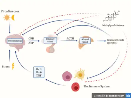 The activation of the hypothalamic-pituitary axis (HPA) stimulates the production of endogenous glucocorticoids within the adrenal cortex.[13] The HPA interprets stimuli (stress, inflammation and circadian cues) and transduces a corresponding physiochemical response.[5] Glucocorticoids released in the blood, serve as a messenger by binding to glucocorticoid receptors in a wide distribution across the body, including the HPA itself.[13] Thus, the physiological range of GCs is monitored by the negative feedback loop GCs exert on any portion of the HPA.[5] Methylprednisolone structurally and functionally mimics endogenous corticoids and will act upon the HPA in a similar fashion.