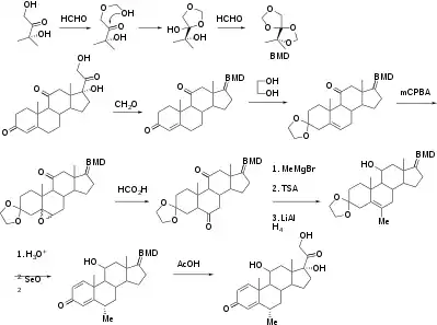 Methylprednisolone, or 6α-methylprednisolone, also known as 11β,17,21-trihydroxy-6α-methylpregna-1,4-diene-3,20-dione, is a synthetic pregnane steroid and a derivative of hydrocortisone (11β,17α,21-trihydroxypregn-4-ene-3,20-dione) and prednisolone (11β,17α,21-trihydroxypregn-1,4-diene-3,20-dione).[40][41] A variety of methylprednisolone esters with differing characteristics exist and have been marketed for medical use.[40][41] They include methylprednisolone aceponate (Advantan), methylprednisolone acetate (Depo-Medrol), methylprednisolone succinate (Solu-Medrol), and methylprednisolone suleptanate (Medrosol, Promedrol).[40][41]
