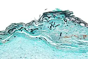 | Micrograph of a superficial dermatomycosis. The fungal organisms are the dark staining, thick, quasi-linear objects below with skin surface. Vulvar biopsy. GMS stain. | |