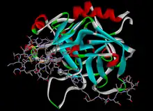 A key event in the final stages of blood coagulation is the conversion of fibrinogen into fibrin by the serine protease enzyme thrombin.[9] Thrombin is produced from prothrombin, by the action of an enzyme, prothrombinase (Factor Xa along with Factor Va as a cofactor), in the final states of coagulation. Fibrin is then cross linked by factor XIII (Fibrin Stabilizing Factor) to form a blood clot. The principal inhibitor of thrombin in normal blood circulation is antithrombin.[8] Similar to antithrombin, the anticoagulant activity of hirudin is based on its ability to inhibit the procoagulant activity of thrombin.