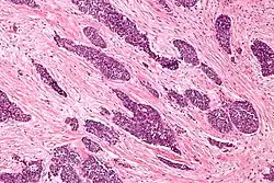 Micrograph of a desmoplastic small round cell tumor, showing the characteristic desmoplastic stroma and angulated nests of small round cells. H&E stain.