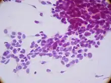 The entity was first described by pathologists William L. Gerald and Juan Rosai in 1989.[12] Pathology reveals well circumscribed solid tumor nodules within a dense desmoplastic stroma. Often areas of central necrosis are present. Tumor cells have hyperchromatic nuclei with increased nuclear/cytoplasmic ratio.