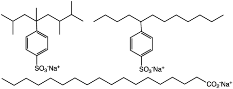 Typical anionic detergents are alkylbenzene sulfonates. The alkylbenzene portion of these anions is lipophilic and the sulfonate is hydrophilic. Two varieties have been popularized, those with branched alkyl groups and those with linear alkyl groups. The former were largely phased out in economically advanced societies because they are poorly biodegradable.[7]