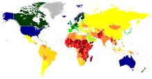Development can be measured by economic or human factors. Developing countries are, in general, countries that have not achieved a significant degree of industrialization relative to their populations, and have, in most cases, a medium to low standard of living. There is an association between low income and high population growth.[32] The development of a country is measured with statistical indices such as income per capita (per person), gross domestic product per capita, life expectancy, the rate of literacy, freedom index and others. The UN has developed the Human Development Index (HDI), a compound indicator of some of the above statistics, to gauge the level of human development for countries where data is available. The UN had set Millennium Development Goals from a blueprint developed by all of the world's countries and leading development institutions, in order to evaluate growth.[33] These goals ended in 2015, to be superseded by the Sustainable Development Goals.