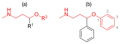 Compounds containing an aryloxypropylamine motif in their structure, demonstrated in figure 3a, are known as monoamine reuptake inhibitors. Drugs containing this privileged structural motif, where R1 and R2 are aryls or heteroaryls, preferable phenyl, possess a selectivity profile for NET and SERT.[35] While compounds containing a substituent in the 2'-position of the aroxyl ring of the structure (figure 3b) exhibits selectivity and high affinity for NET, and are therefore generally SNRIs, compounds having substituent in the 4'-position exhibits selectivity and high affinity for SERT and are therefore generally SSRIs, e.g. fluoxetine and paroxetine.[36]