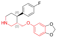 Paroxetine is a constrained structural analogue of fluoxetine where the linear phenylpropylamine group of fluoxetine has been folded into a piperidine ring (figure 5). The compound has the possibility of four stereoisomers because it contains two chiral centers, but one of them, the (3S,4R)-isomer, is marketed as paroxetine. Research has shown that stereochemical factors affect affinity of the molecule for SERT where substitution into the 2-ortho-position of either aromatic rings decreases affinity for rat SERT by as much as 10–100 times, where the greatest loss occurs in the phenoxy ring.[5]