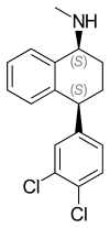 Tametraline, a compound synthesized in 1978 by Pfizer, was shown to be a potent NE and DA re-uptake inhibitor with animal studies.[5] Later on a surprisingly substantial enhancement of blocking activity of 5-HT uptake was achieved by adding chlorine atoms at C-3 and C-4 to the structure of tametraline, resulting in (+)-trans-(1R,4S)-N-methyl-4-phenyl-1-aminotetralin, a potent but nonselective uptake blocker. The (+)-cis-(1S,4S)-isomer, one of four compounds diastereomers, however exhibited significantly more selective and potent 5-HT uptake inhibiting activity compared to the other three diastereomers, where the 4-phenyl ring favours attachments at 5-HT uptake sites. The compound was named sertraline (figure 8).[5][40] Although sertraline appears to differ structurally from the other SSRIs, it has a phenylaminotetralin in its structure, in which the diphenylpropylamine nucleus has been forced into a stiff bicyclic ring system.[5]