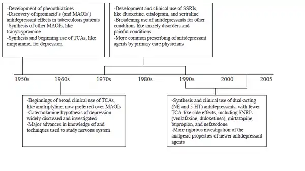 Before the discovery of SSRI drugs, the treatments for mood disorders were relatively limited. Now, however, there are dozens of antidepressants on the market for the treatment of depression.[4] Monoamine oxidase inhibitors (MAOIs) and tricyclic antidepressants (TCAs) were the first drugs to be developed for the treatment of depression, dating back to the early 1950s. Because of their undesirable adverse-effect profile and high potential for toxicity, due to their non-selective pharmacological effects, strict regiments were needed for taking the drugs, which limited their use.[4][5] Because of this, researchers looked for other alternatives with similar effectiveness but fewer adverse effects e.g. drugs that did not cause cardiac conduction abnormalities in overdoses or had the tendency to cause seizures,[6] which led to the discovery of the SSRI drugs. The SSRIs are the most significant class of antidepressants marketed in recent years and are one of the major medicinal discoveries of the last few decades. SSRIs were the first drugs to establish a theoretical pathophysiological role for 5-HT in affective illnesses and in the broad spectrum of anxiety disorders. Likewise, they were the first to confirm the inhibition of neurotransmitter re-uptake as an important therapeutic principle.[1][7]