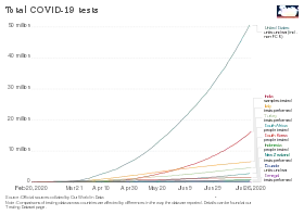 On 16 March, the WHO called for ramping up testing programmes as the best way to slow the spread.[6][7] Several European countries initially conducted more tests than the US.[46][47] By 19 March, drive-in tests were offered in several large cities.[48]