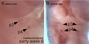 Studies in mice have shown that interfering with the HOX15 gene can cause parathyroid gland aplasia, which suggests the gene plays an important role in the development of the parathyroid gland.[8] The genes, TBX1, CRKL, GATA3, GCM2, and SOX3 have also been shown to play a crucial role in the formation of the parathyroid gland. Mutations in TBX1 and CRKL genes are correlated with DiGeorge syndrome, while mutations in GATA3 have also resulted in a DiGeorge-like syndrome.[9] Malformations in the GCM2 gene have resulted in hypoparathyroidism.[10] Studies on SOX3 gene mutations have demonstrated that it plays a role in parathyroid development. These mutations also lead to varying degrees of hypopituitarism.[11]
