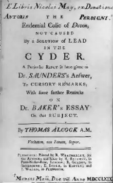 William Musgrave's publication De arthritide symptomatica (2nd edn, 1715) included the first scientific description of "Devonshire colic" – it was later referred to by John Huxham and Sir George Baker.[1]