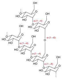 Dextrins can be produced from starch using enzymes like amylases, as during digestion in the human body and during malting and mashing,[3] or by applying dry heat under acidic conditions (pyrolysis or roasting). This procedure was first discovered in 1811 by Edme-Jean Baptiste Bouillon-Lagrange.[4] The latter process is used industrially, and also occurs on the surface of bread during the baking process, contributing to flavor, color and crispness. Dextrins produced by heat are also known as pyrodextrins. Starch hydrolyses during roasting under acidic conditions, and short-chained starch parts partially rebranch with α-(1,6) bonds to the degraded starch molecule.[5] See also Maillard reaction.