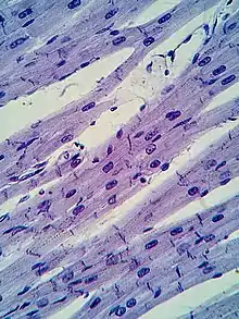Cardiomyocytes are a particular form of myocyte, only present in heart tissue. Along with the basic myocyte elements, these cells also contain one to four nuclei and a large amount of Adenosine Triphosphate (ATP).[2] These additions aid in the heart's resistance to fatigue to consistently pump blood throughout the body to deliver oxygen. Most muscle cells contain a triad, which is a joining of 2 terminal cisternae of the sarcoplasmic reticulum and one t- tubule. However, cardiac muscle cells contain a diad, which is a linking of only one sarcoplasmic reticulum with its respective t-tubule. Another notable distinction between all muscle cells and cardiac muscle cells is the presence of intercalated discs. These tight connections between the cardiomyocytes allows for the accelerated sending of action potential signals to perform the rapid, rhythmic contraction of the heart muscle.