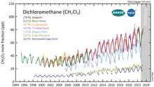 Ozone concentrations measured at the midlatitudes from the ground up through the stratosphere from 1998 to 2016 have declined by 2.2 Dobson units,[47] just under 1%.[48] The reasons for this decline are unclear, but one unverified hypothesis is the presence of short-lived substances such as dichloromethane in the lower atmosphere.[49]