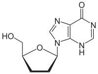 Didanosine (ddI) is a nucleoside analogue of adenosine.[9] It differs from other nucleoside analogues, because it does not have any of the regular bases, instead it has hypoxanthine attached to the sugar ring. Within the cell, ddI is phosphorylated to the active metabolite of dideoxyadenosine triphosphate, ddATP, by cellular enzymes. Like other anti-HIV nucleoside analogs, it acts as a chain terminator by incorporation and inhibits viral reverse transcriptase by competing with natural dATP.