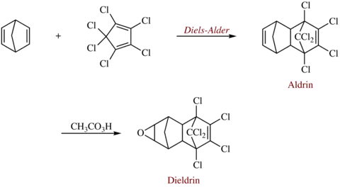 Dieldrin can be formed from the Diels-Alder reaction of hexachloro-1,3-cyclopentadiene with norbornadiene followed by epoxidation of the addition product with a peroxy acid such as peracetic acid as shown below. [6]