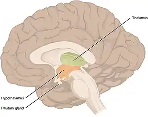 Diencephalic syndrome was first described by Dr. A. Russell in 1951.[3] It is usually caused by a brain tumor such as a low-grade glioma or astrocytoma located in the hypothalamic-optic chiasmatic region.[1] It is not yet understood how diencephalic syndrome causes the effects on appetite and metabolism which are seen, though inappropriately high growth hormone release has been proposed,[4] as has excessive β-lipotropin secretion[1] and overall increased metabolic demand.[5] It is treated with nutritional optimisation while the underlying lesion is treated with chemotherapy, surgery or radiotherapy.