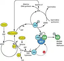 The products of these reactions are methylated DNA, RNA or proteins and S-adenosylhomocysteine (SAH). SAH has a negative feedback on its own production as an inhibitor of methyltransferase enzymes. Therefore, SAM:SAH ratio directly regulates cellular methylation, whereas levels of vitamins B6, B12, folic acid and choline regulates indirectly the methylation state via the methionine metabolism cycle.[88][89] A near ubiquitous feature of cancer is a maladaption of the methionine metabolic pathway in response to genetic or environmental conditions resulting in depletion of SAM and/or SAM-dependent methylation. Whether it is deficiency in enzymes such as methylthioadenosine phosphorylase, methionine-dependency of cancer cells, high levels of polyamine synthesis in cancer, or induction of cancer through a diet deprived of extrinsic methyl donors or enhanced in methylation inhibitors, tumor formation is strongly correlated with a decrease in levels of SAM in mice, rats and humans.[90][91]