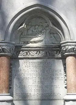 William T. G. Morton participated in a public demonstration of ether anesthesia on October 16, 1846, at the Ether Dome in Boston, Massachusetts. However, Crawford Williamson Long is now known to have demonstrated its use privately as a general anesthetic in surgery to officials in Georgia, as early as March 30, 1842, and Long publicly demonstrated ether's use as a surgical anesthetic on six occasions before the Boston demonstration.[14][15][16] British doctors were aware of the anesthetic properties of ether as early as 1840 where it was widely prescribed in conjunction with opium.[17] Diethyl ether largely supplanted the use of chloroform as a general anesthetic due to ether's more favorable therapeutic index, that is, a greater difference between an effective dose and a potentially toxic dose.[18]