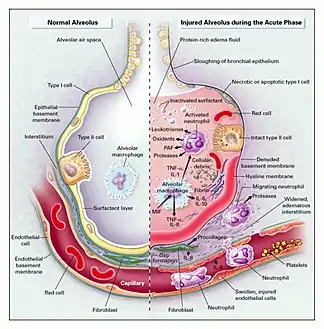 Once the initial insult has damaged the alveoli and begun the process of DAD, the condition will typically progress in three phases: exudative, proliferative, and fibrotic.[6] Below are the description of the phases, paraphrased from Sweeney et al. (2016).[6]