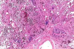 | Micrograph showing a pulmonary hemorrhage. H&E stain. | |