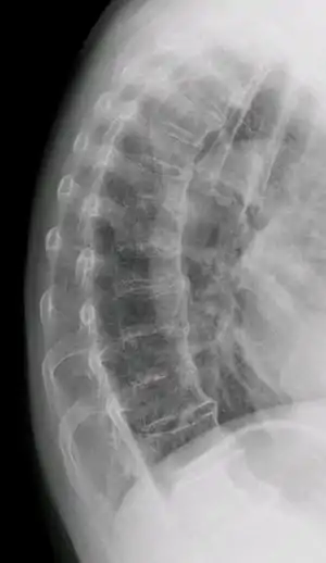 Diffuse idiopathic skeletal hyperostosis (DISH) is a condition characterized by abnormal calcification/bone formation (hyperostosis) of the soft tissues surrounding the joints of the spine, and also of the peripheral or appendicular skeleton.[1] In the spine, there is bone formation along the anterior longitudinal ligament and sometimes the posterior longitudinal ligament, which may lead to partial or complete fusion of adjacent vertebrae. The facet and sacroiliac joints tend to be uninvolved. The thoracic spine is the most common level involved.[2] In the peripheral skeleton, DISH manifests as a calcific enthesopathy, with pathologic bone formation at sites where ligaments and tendons attach to bone.