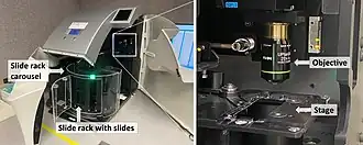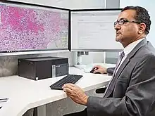 Digital pathology is a sub-field of pathology that focuses on data management based on information generated from digitized specimen slides. Through the use of computer-based technology, digital pathology utilizes virtual microscopy.[1] Glass slides are converted into digital slides that can be viewed, managed, shared and analyzed on a computer monitor. With the practice of Whole-Slide Imaging (WSI), which is another name for virtual microscopy,[2] the field of digital pathology is growing and has applications in diagnostic medicine, with the goal of achieving efficient and cheaper diagnoses, prognosis, and prediction of diseases due to the success in machine learning and artificial intelligence in healthcare.