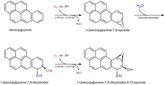 Metabolism of benzo[a]pyrene yielding the carcinogenic benzo[a]pyren-7,8-dihydrodiol-9,10-epoxide.