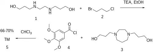 The reaction of bis-(3-hydroxypropyl)-ethylene diamine (1) with 1-Bromo-3-chloropropane (2) gives homopiperazine [19970-80-0] (3). Esterification by reaction with 3,4,5-Trimethoxybenzoyl Chloride [4521-61-3] (4) completed the synthesis of Dilazep (5).