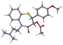 Diltiazem, also known as (2S,3S)-3-acetoxy-5-[2-(dimethylamino)ethyl]-2,3-dihydro-2-(4-methoxyphenyl)-1,5-benzothiazepin-4(5H)-one hydrochlorid has a vasodilating activity attributed to the (2S,3S)-isomer.[28] Diltiazem is a potent vasodilator, increasing blood flow and variably decreasing the heart rate via strong depression of A-V node conduction. It binds to the alpha-1 subunit of L-type calcium channels in a fashion somewhat similar to verapamil, another nondihydropyridine (non-DHP) calcium channel blocker.[29] Chemically, it is based upon a 1,4-thiazepine ring, making it a benzothiazepine-type calcium channel blocker.
