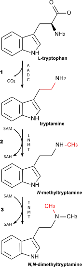 122. Dean JG, Liu T, Huff S, Sheler B, Barker SA, Strassman RJ, et al. (June 2019). "Biosynthesis and Extracellular Concentrations of N,N-dimethyltryptamine (DMT) in Mammalian Brain". Scientific Reports. 9 (1): 9333. Bibcode:2019NatSR...9.9333D. doi:10.1038/s41598-019-45812-w. PMC 6597727. PMID 31249368.
